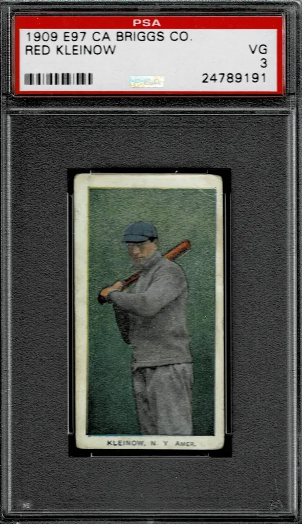 The 1909-10 E97 CA Briggs Caramel Cards (C.A. Briggs Lozenge Makers) set is one of the rarer E-Card issues. These cards measure 1-1/2 x 2-3/4. Despite having a small amount of cards, completing the set is somewhat difficult. Many collectors have attempted to finish this without success.