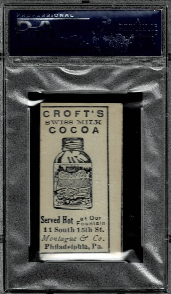 The E92 Caramel Cards Croft’s Cocoa were produced in 1909 and contain multiple back advertisers. These are a bit confusing as each back has a different amount of cards in each set. The fronts of the cards are consistent throughout each of the 4 subsets; however, the reverse will show a full advertisement for each company. Backs show the Croft’s Bottle al0ng with the address of their building in Philadelphia. These cards are sized at 1-1/2 x 2-3/4 with a small variation for mis-cuts.