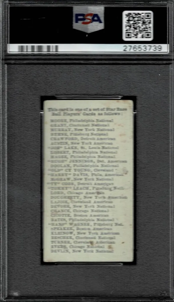 This set is unique as there are multiple different “stamped” backs. These advertisers where stamped in place since the back of the cards had no indication who printed them. Additionally, the fronts of the cards come in multiple colors with the same pose. To this day, there are new discoveries of player/pose/colors.