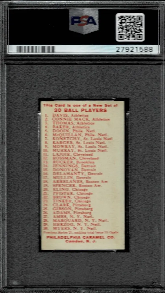 The Philadelphia Caramel Baseball Cards set (E96) the second portion of the E95/E96 set. This second set has 30 cards which brings the entire 2 set group to 55 total cards. The labeling on these cards are very easy to identify as they are in bright read and have all 30 subjects listed.